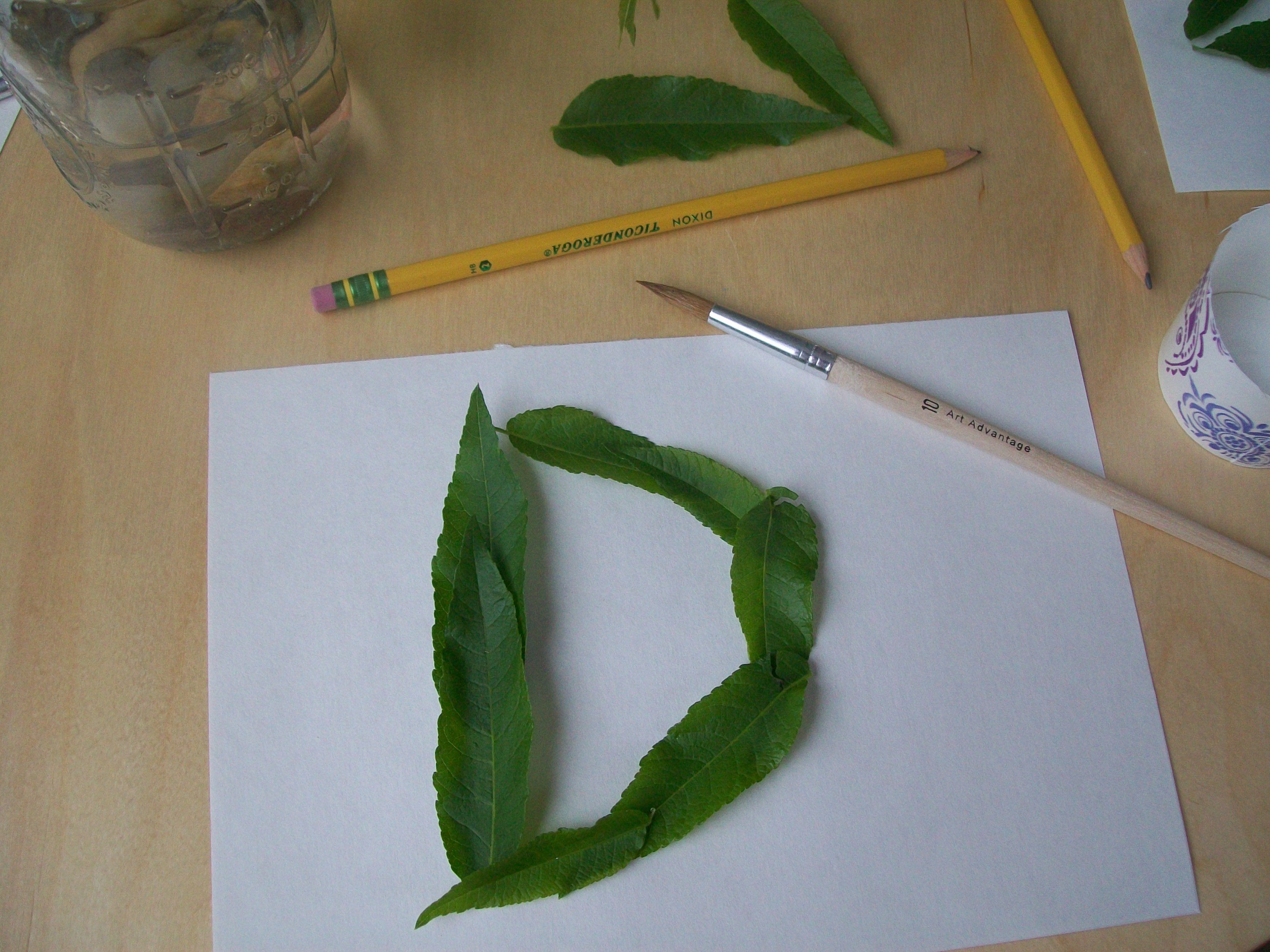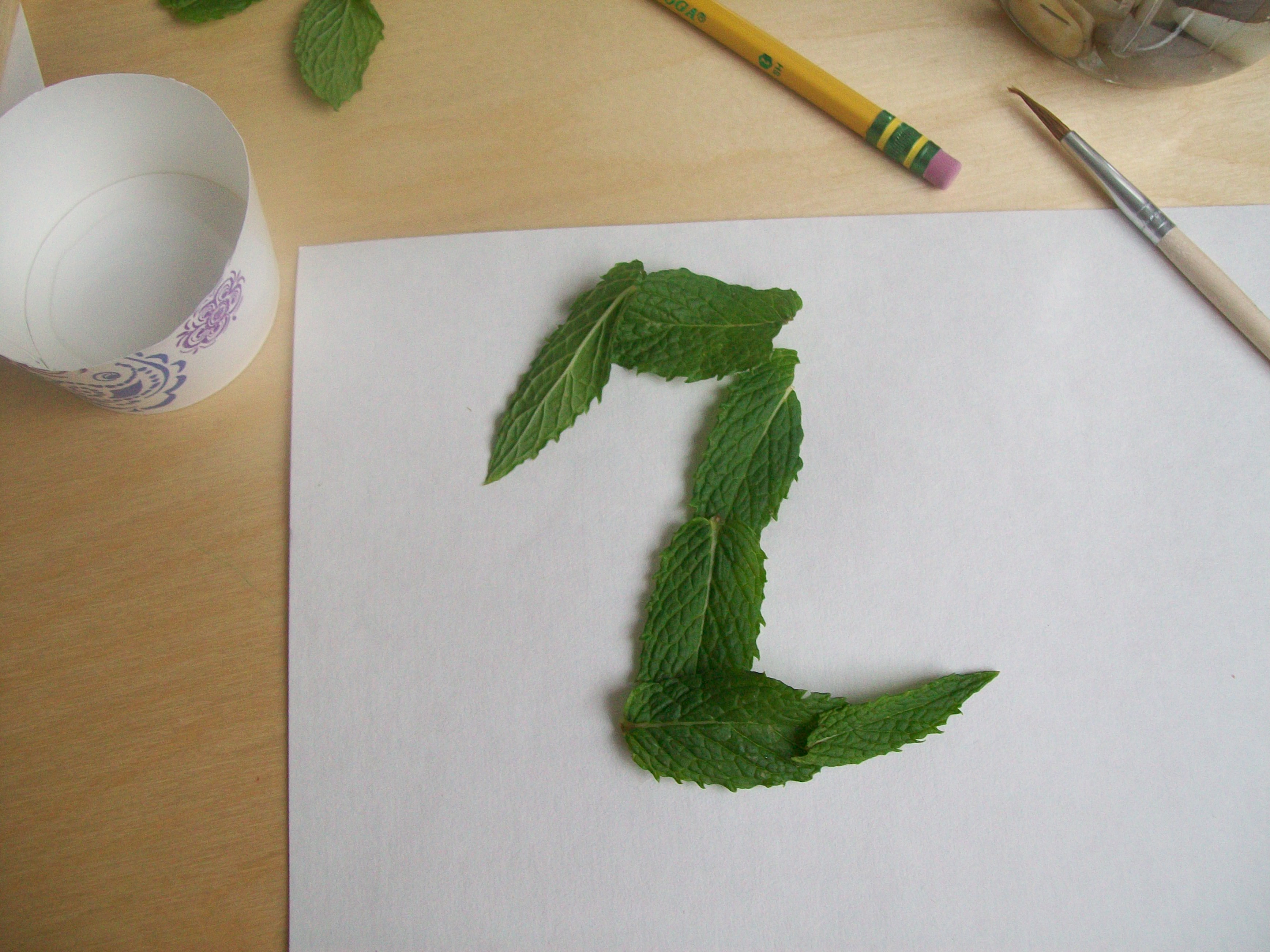 I have this tree/ shrub that is very evasive, so I don’t mind clipping off of it now and then.  I also have some lemon mint, so I decided to set up an alphabet and number provocation using those two plants. :)