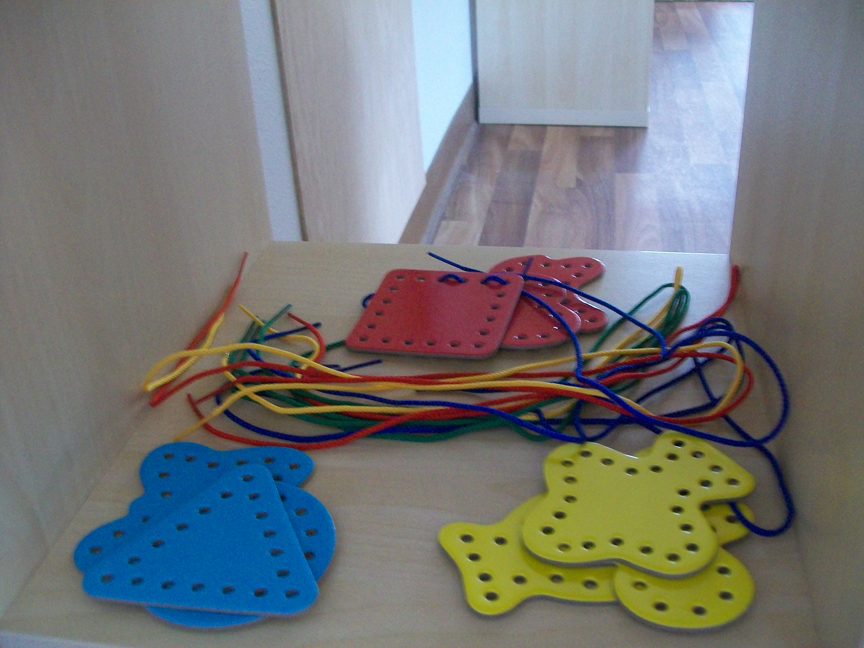 Lacing cards are also a good lead in to learning how to tie shoe laces on children’s shoes.  The key to remember for both tasks is that it takes time.  Allow your child time to experiment and practice.  Be there to guide and support and not criticize.