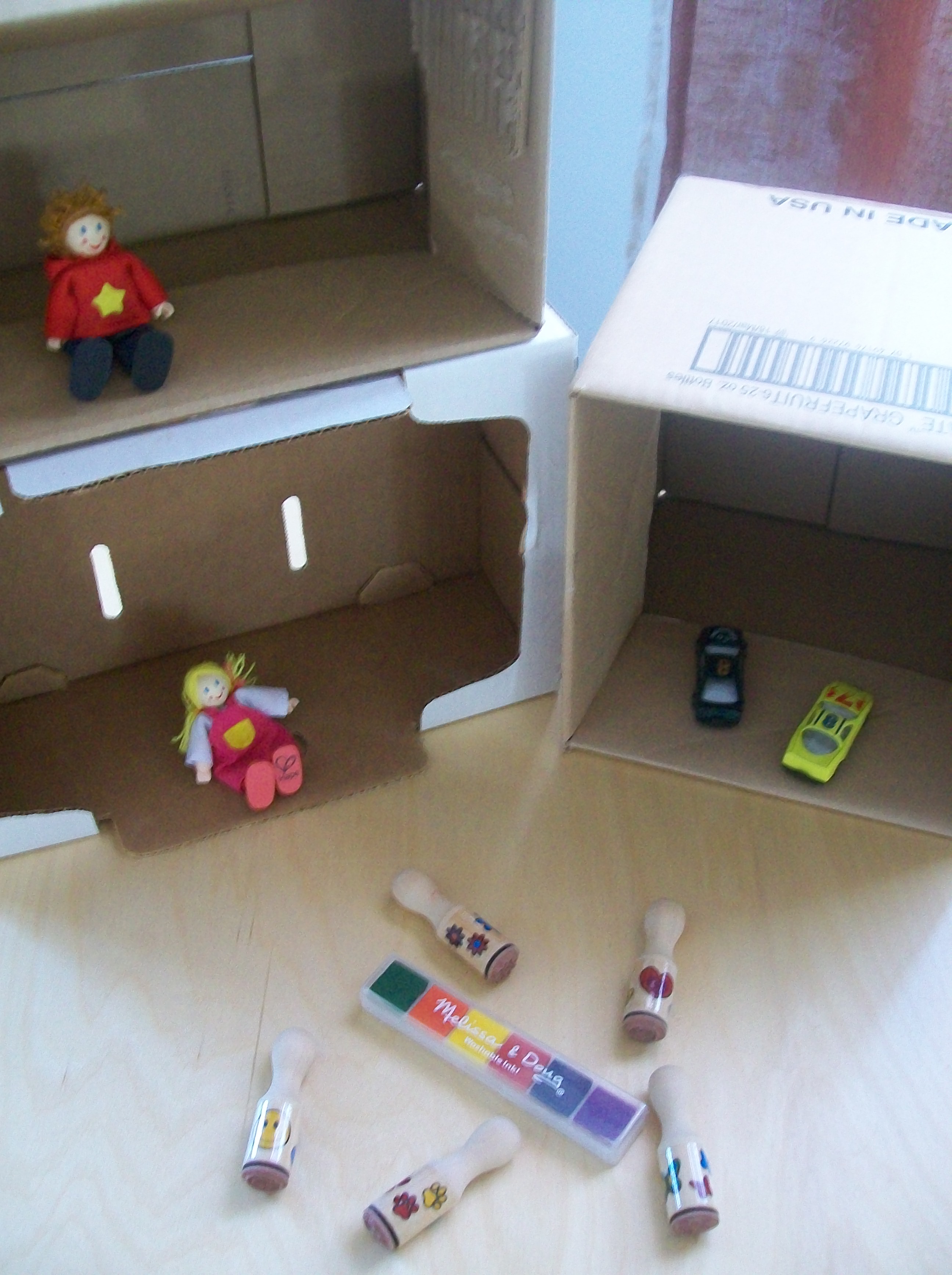 100_7884   100_7915 Using small wooden dolls to encourage reading and telling stories is also another way of utilizing fine motor skills and communication.  This time the dialogue can be about stories the children currently love and can’t get enough of, or stories they’ve never heard until today.  The children may be inspired by the stories a Teacher or Parent reads and they may use their dolls to act out the characters.  More creativity and detail can go into a child’s inspired representation of a story if given the chance to allow their ideas to emerge.  Teacher’s and Parents are scribes until the child is older and can write for themselves.  Fine motor development happens as children create the world the doll lives in as he/ she creates the story props.  Recyclable materials come in handy for encouraging a child to continue with his/ her creative story telling  and fine motor development.  Once again deep and enriching learning is happening when children are allowed to explore, create, question and implement ideas encompassing fine motor and communication development.