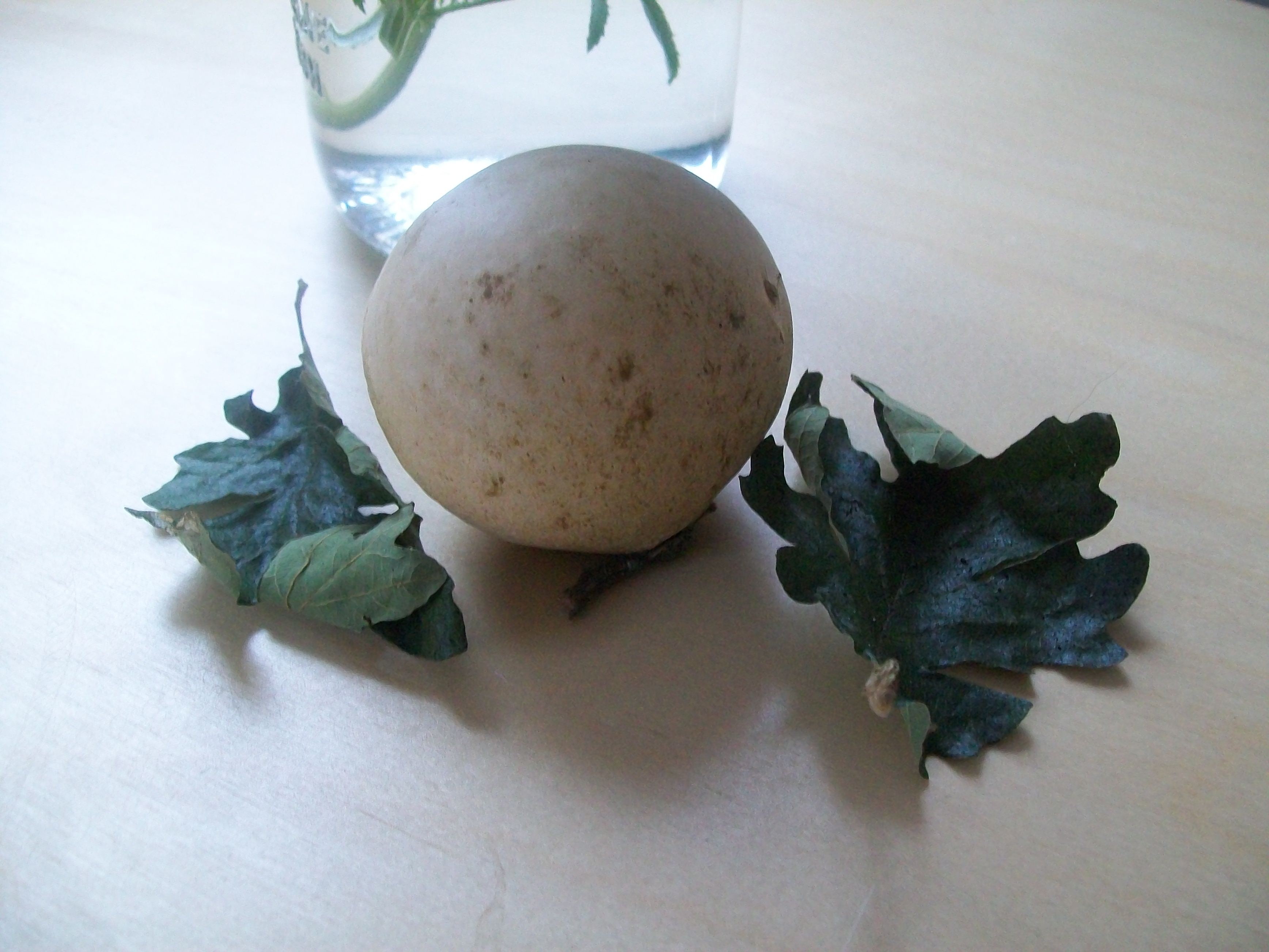 100_8129 Here is a close up of a gall from an oak tree.  Notice the cream color with darker brown spots.  Galls are a great way to teach children about how not all plant life is meant for insects and how insects can hurt a tree.  For young children I would start out with stories about the specific tree or plant life I want the children to explore.  This may not be an interest to the children yet, but once we visit the topic in very well may become a huge interest.  To learn more about the tree I would encourage discussions around the topic.  Next I would set up a project approach with the children.  This way the children are partners with me, the Teacher, and will be engaged in the whole process of learning about galls without this being a Teacher driven and directed project.  The children will plan each step of the project with the Teacher; we are partners in learning.