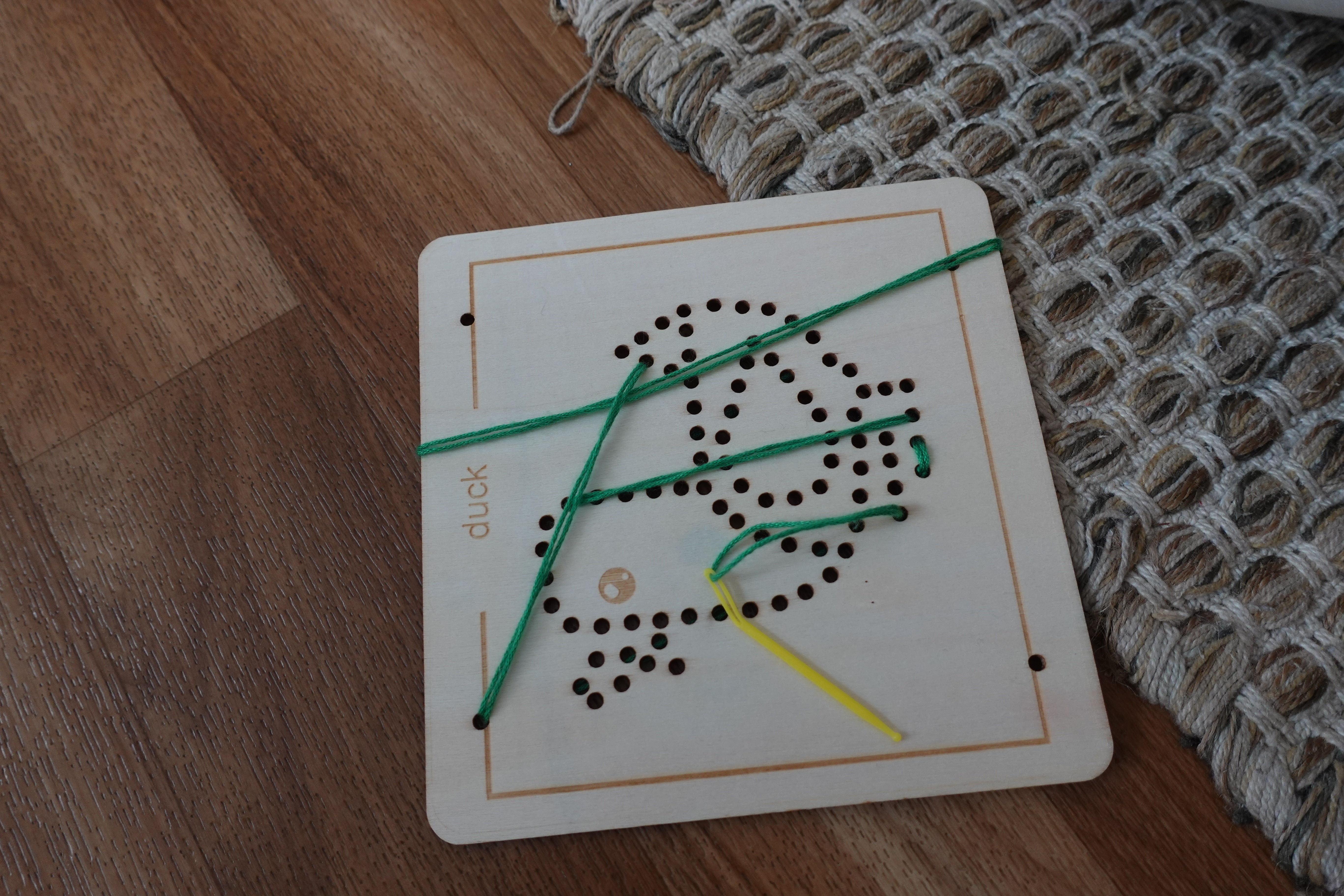 Lacing cards (see part #1) no doubt help young children support the healthy growth and development of fine motor muscles. It is also a good way to see where a child is on that developmental pathway. When young children lack advancement in their fine motor muscles, they lack the ability to control the needle and thread to twist, turn, lengthen, and shorten the thread to complete the picture as is. The intent for where the thread is aimed, the length of the thread before entering another hole, and how the string is crossed show how much growth and experience are needed in this area, or what is not needed. Wherever a child is on their fine motor skills developmental pathway is a positive thing. I love seeing early stages of sewing, because it gives me, as a teacher, information I need to know about what my students can do in this moment, and it reminds me to pay attention and document these expressions of ability so I can see and support the growth with appropriate challenges as the year progresses.